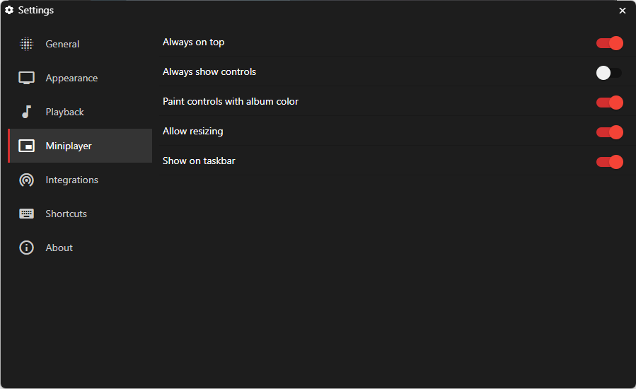 미니플레이어에는 앨범 커버 이미지가 뜨고 마우스를 갖다대면 곡 정보와 재생/곡 넘기기 버튼이 뜬다 (Always show controls 설정을 껐을 경우). Allow resizing 설정을 하면 크기도 마음대로 조절할 수 있다.