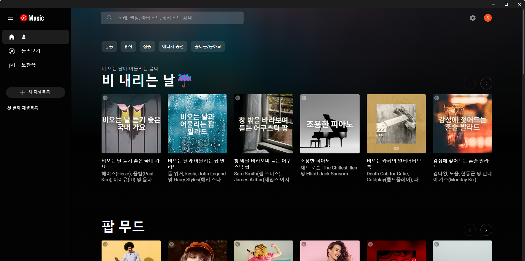 그러면 이후부터는 이렇게 실행할 때마다 유튜브 뮤직 메인 화면이 나올 것이다.