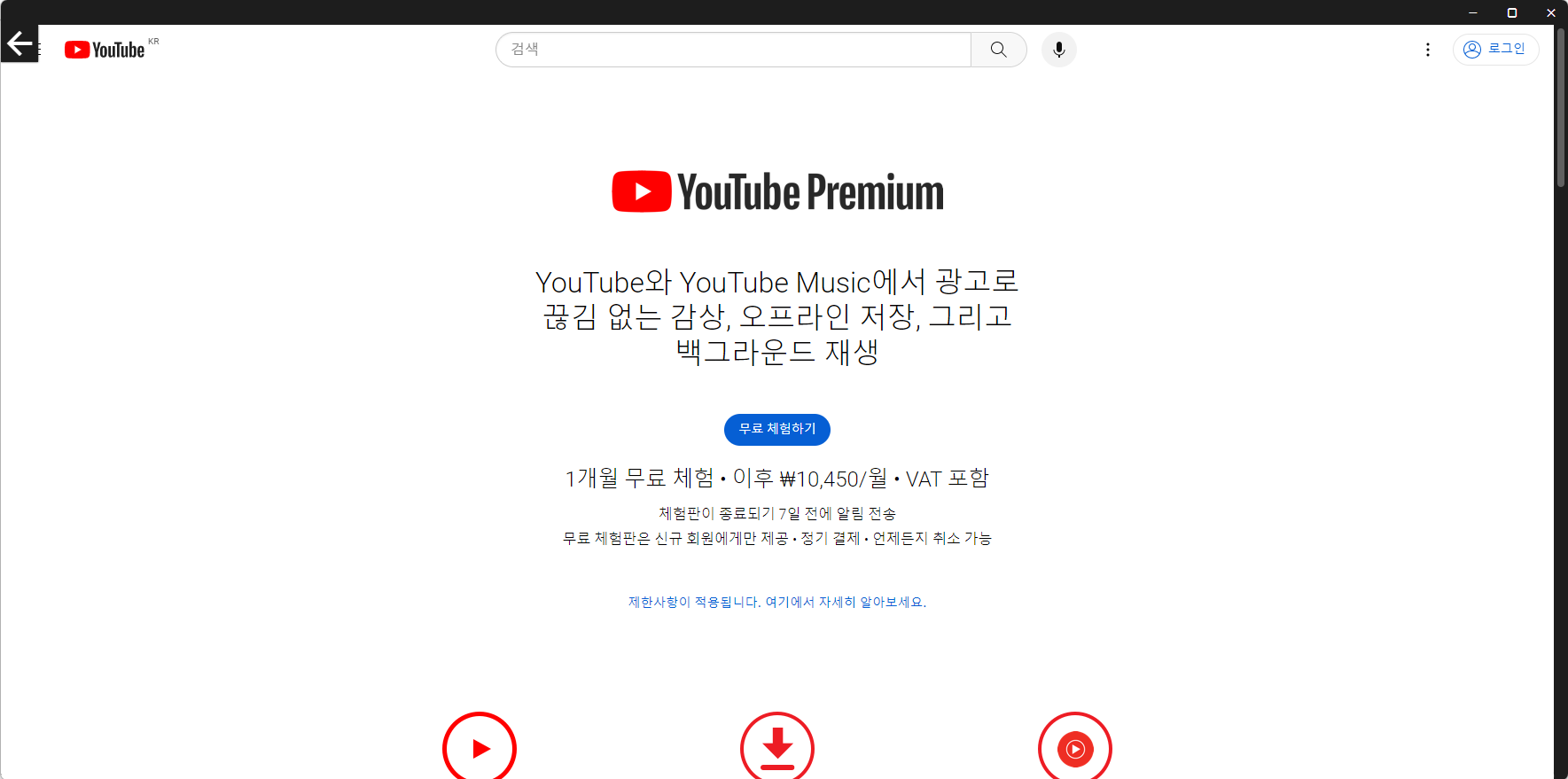 설치된 프로그램을 처음 실행하면 로그인이 안된 상태로 인터넷 창 같은 형태가 나온다. 오른쪽 위의 로그인 버튼을 눌러 유튜브 뮤직을 사용하는 계정으로 로그인 하면 된다.