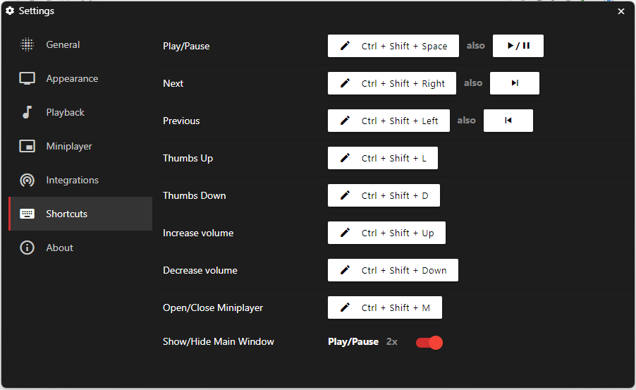 개인적으로 유용하다고 생각하는 기능들은 Miniplayer 탭과 Shortcuts 탭에 있는 설정들이다. 미니 플레이어를 만들어서 항상 위에 창이 오도록 할 수 있고 여러 단축키들을 설정할 수 있다.