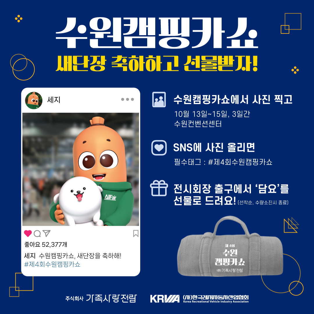 두 번째로는 수원캠핑카쇼에서 사진을 찍고 SNS에 해쉬태그 #제4회수원캠핑카쇼 와 함께 사진을 올리면 담요를 선착순으로 증정하는 이벤트도 있습니다.
